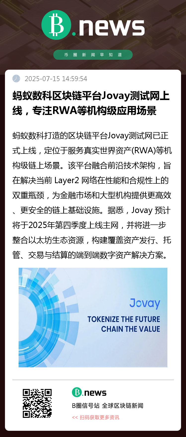 蚂蚁数科打造的区块链平台Jovay 测试网已正式上线,定位于服务真实世界资产(RWA)等机构级链上场景。该平台融合前沿技术架构,旨在解决当前 Layer2 网络在性能和合规性上的双重瓶颈,为金融市场和大型机构提供更高效、更安全的链上基础设施。