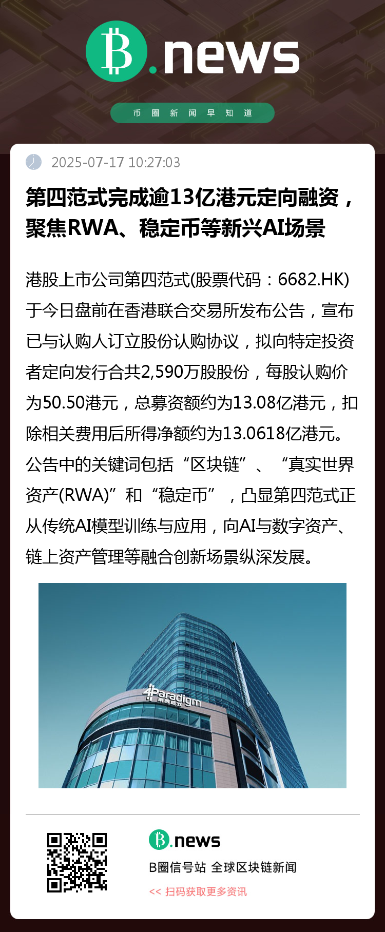 公告中的关键词包括“区块链”、“真实世界资产(RWA)”和“稳定币”,凸显第四范式正从传统AI模型训练与应用,向AI与数字资产、链上资产管理等融合创新场景纵深发展。