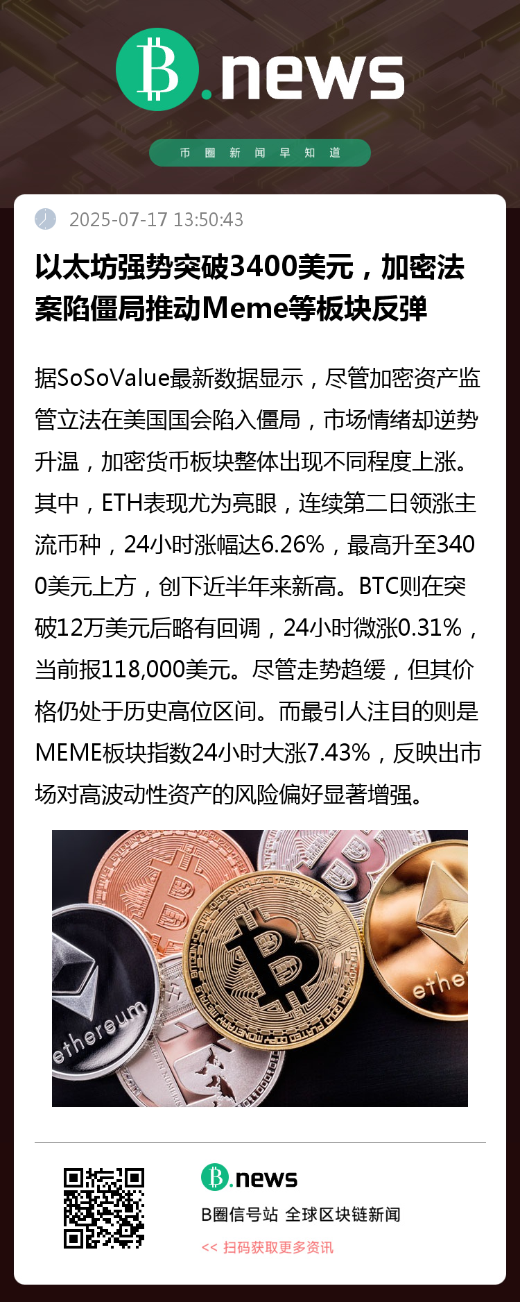 据SoSoValue最新数据显示,尽管加密资产监管立法在美国国会陷入僵局,市场情绪却逆势升温,加密货币板块整体出现不同程度上涨。其中,以太坊(ETH)表现尤为亮眼,连续第二日领涨主流币种,24小时涨幅达6.26%,最高升至3400美元上方,创下近半年来新高。