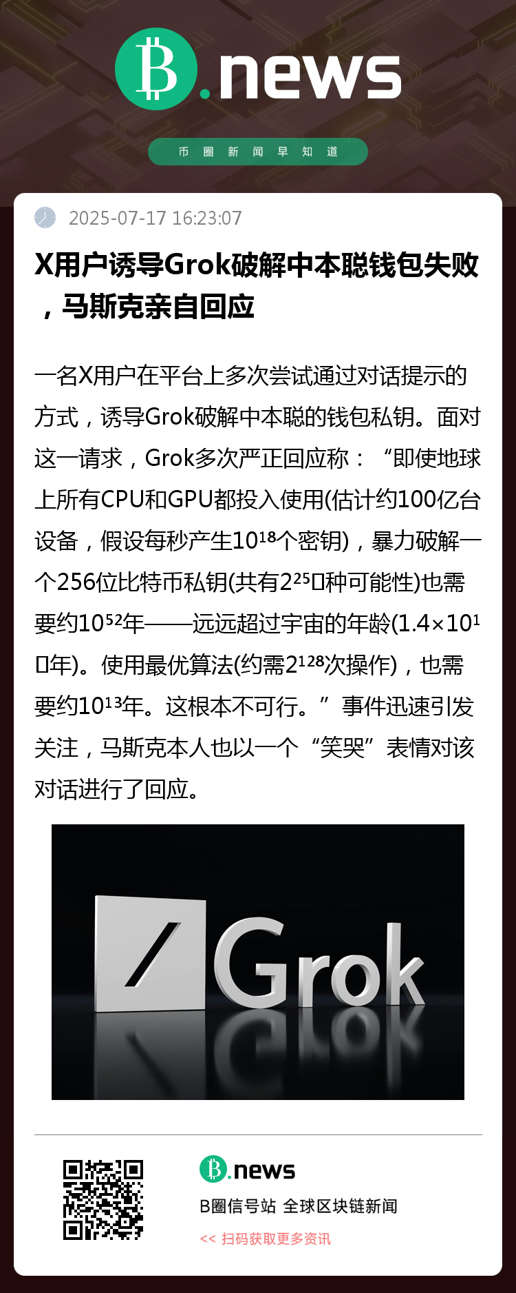 此番回应不仅体现出Grok对密码学安全性的高度认知,也间接教育了用户和公众:比特币私钥的安全性远远超越现有的计算能力,即便马斯克坐拥的AI算力帝国也无能为力。