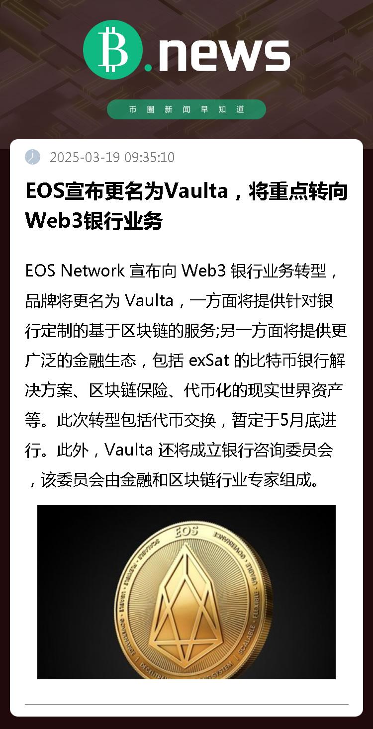 EOS Network 宣布向 Web3 银行业务转型,品牌将更名为 Vaulta,一方面将提供针对银行定制的基于区块链的服务;另一方面将提供更广泛的金融生态,包括 exSat 的比特币银行解决方案、区块链保险、代币化的现实世界资产等。