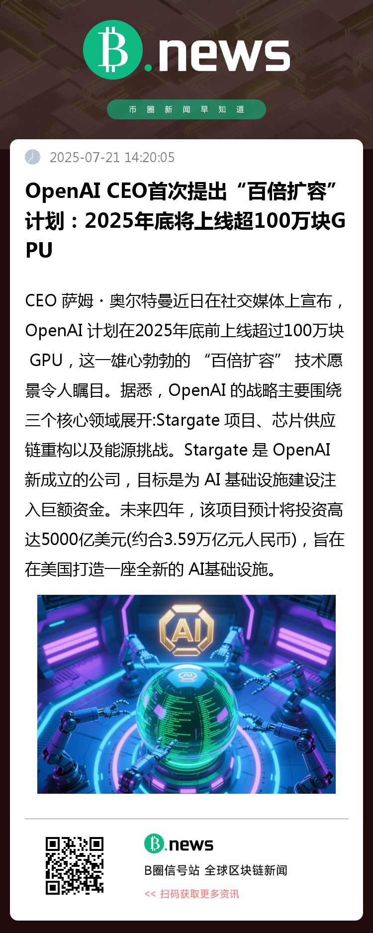 Stargate 项目的首期工程设立在得克萨斯州的阿比林市,占地1000英亩,计划建造全球最大的 AI 训练集群。OpenAI 与软银、甲骨文等多家知名企业建立了紧密的合作关系。软银 CEO 孙正义将担任 Stargate 董事长,负责整体财务规划,而 OpenAI 则负责日常运营。 除了 Stargate 项目外,OpenAI 还将与 Arm、微软和英伟达等巨头合作,进一步推动 AI 技术的发展与应用。这一系列的举措显示了 OpenAI 在全球 AI 基础设施竞赛中的强烈竞争意识和技术雄心。 值得一提的是,随着 GPU 需求的激增,OpenAI 的计划将可能引发市场的剧烈反响。AI 行业的竞争正日益白热化,OpenAI 的 “百倍扩容” 愿景不仅是自身发展的重要里程碑,也将深刻影响整个行业的格局与未来。 OpenAI 的战略布局预示着 AI 技术将进入一个新的高速发展阶段,未来的 AI 应用将会更加广泛和深入,值得我们持续关注。