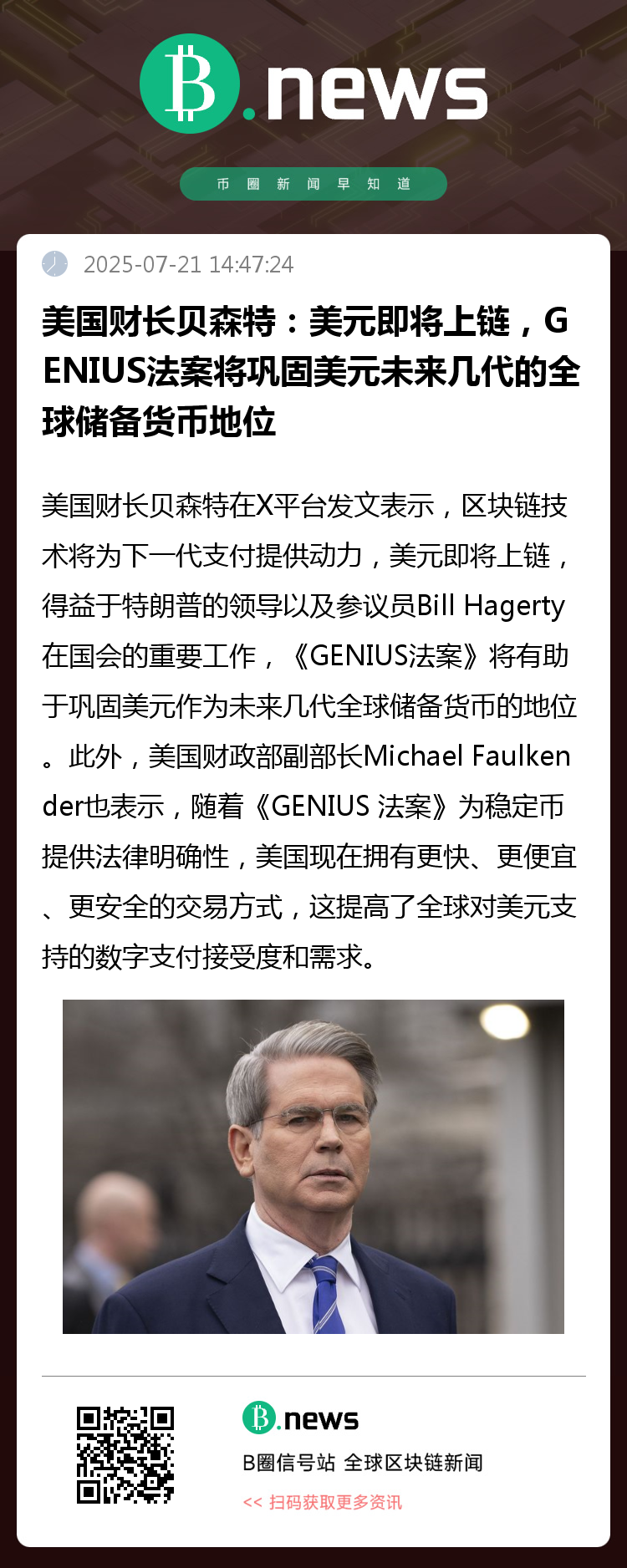 美国财长贝森特在X平台发文表示,区块链技术将为下一代支付提供动力,美元即将上链(the U.S. dollar is coming onchain),得益于特朗普的领导以及参议员Bill Hagerty在国会的重要工作,《GENIUS法案》将有助于巩固美元作为未来几代全球储备货币的地位。