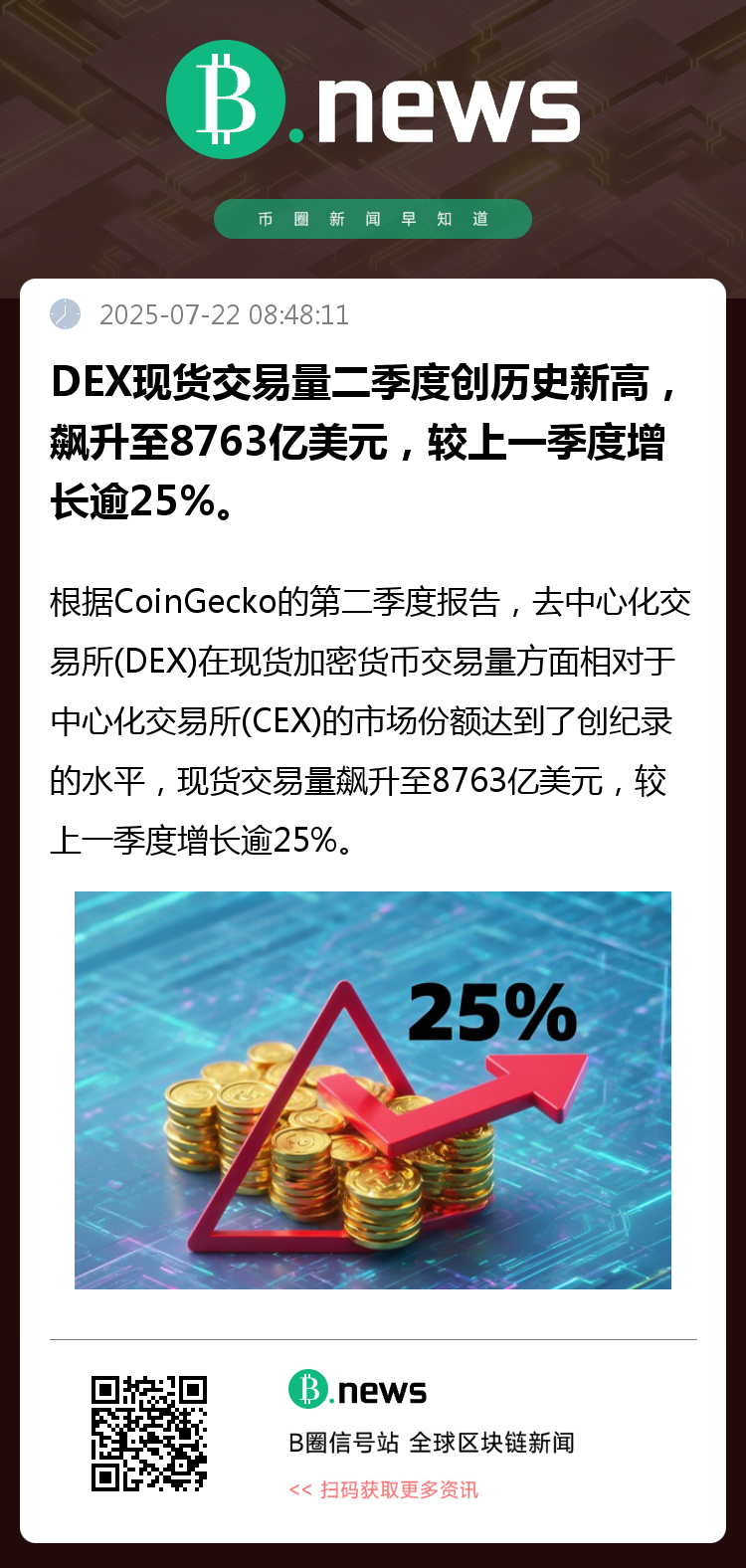 报告指出,去中心化交易所(DEX)的现货交易量飙升至8763亿美元,较上一季度增长逾25%。