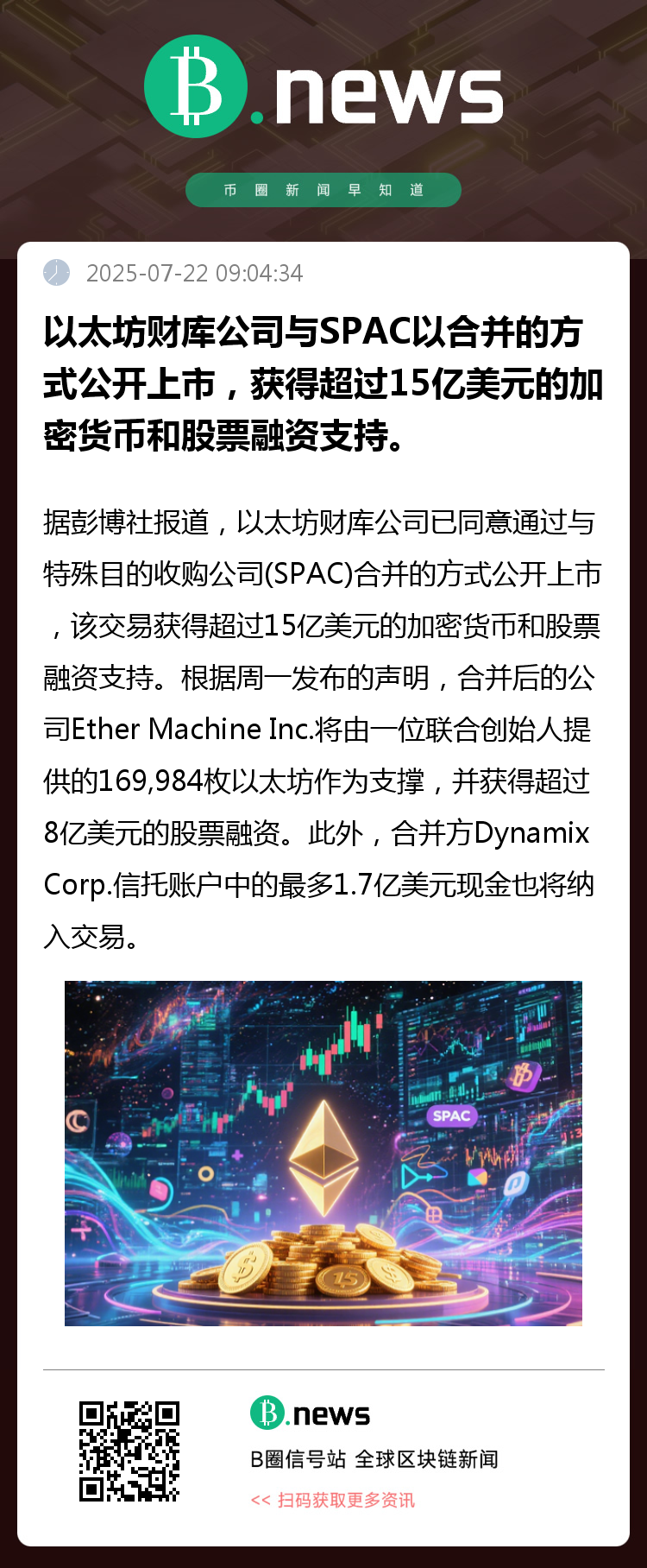 据彭博社报道,以太坊财库公司已同意通过与特殊目的收购公司(SPAC)合并的方式公开上市,该交易获得超过15亿美元的加密货币和股票融资支持。