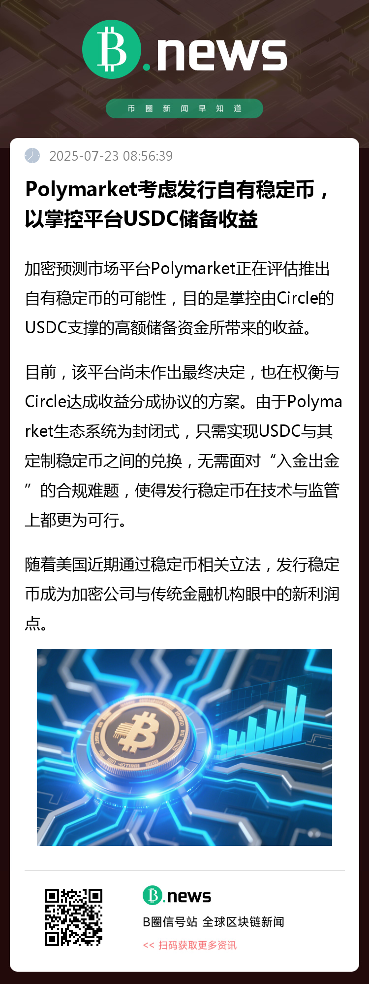 加密预测市场平台Polymarket正在评估推出自有稳定币的可能性,目的是掌控由Circle的USDC支撑的高额储备资金所带来的收益。