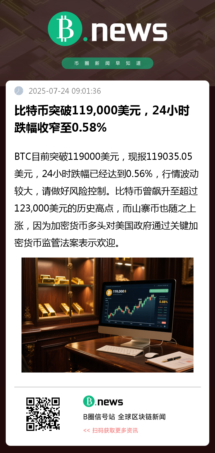 BTC目前突破119000美元,现报119035.05美元,24小时跌幅达到0.56%,行情波动较大,请做好风险控制。