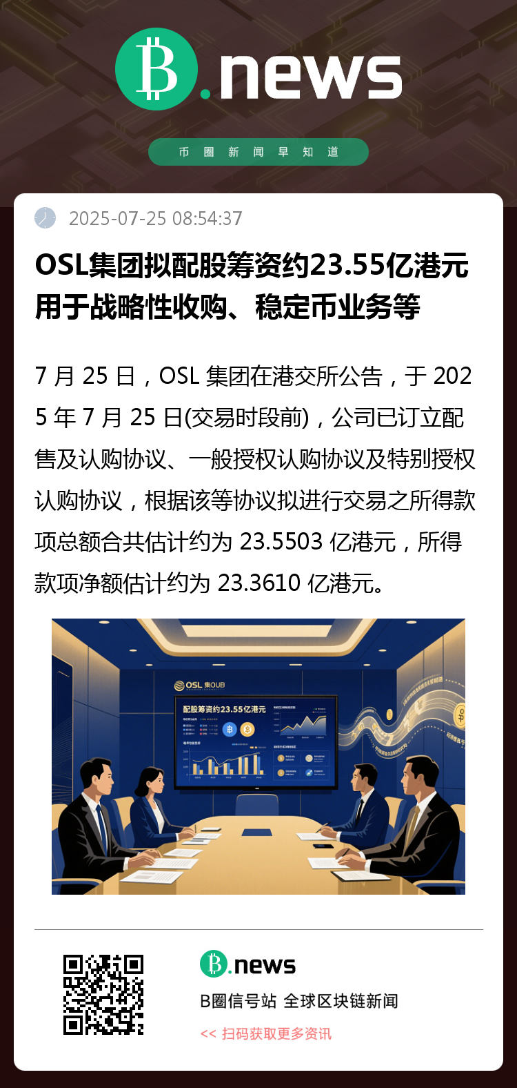 7 月 25 日,OSL 集团在港交所公告,于 2025 年 7 月 25 日(交易时段前),公司已订立配售及认购协议、一般授权认购协议及特别授权认购协议,根据该等协议拟进行交易之所得款项总额合共估计约为 23.5503 亿港元,所得款项净额估计约为 23.3610 亿港元。