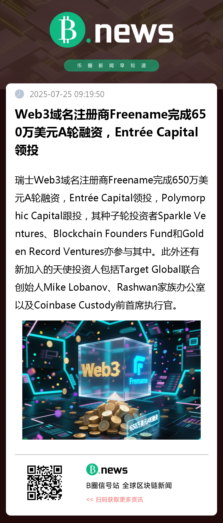 据Finsmes报道,瑞士Web3域名注册商Freename完成650万美元A轮融资,Entrée Capital领投,Polymorphic Capital跟投,其种子轮投资者Sparkle Ventures、Blockchain Founders Fund和Golden Record Ventures亦参与其中,此外还有新加入的天使投资人,包括Target Global联合创始人Mike Lobanov、Rashwan家族办公室以及Coinbase Custody前首席执行官Aaron Schnarch。