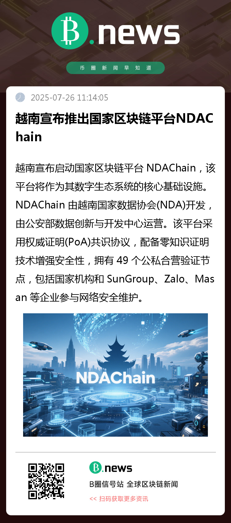越南宣布启动国家区块链平台 NDAChain,该平台将作为其数字生态系统的核心基础设施。
