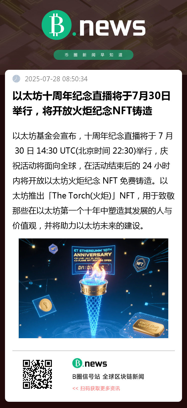 以太坊基金会宣布,十周年纪念直播将于 7 月 30 日 14:30 UTC(北京时间 22:30)举行,庆祝活动将面向全球,在活动结束后的 24 小时内将开放以太坊火炬纪念 NFT 免费铸造。