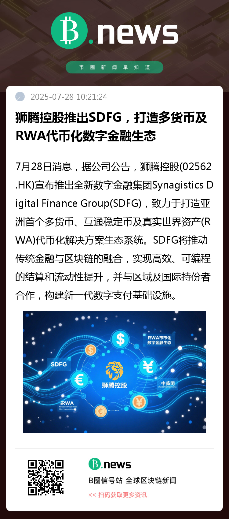7月28日消息,据公司公告,狮腾控股(02562.HK)宣布推出全新数字金融集团Synagistics Digital Finance Group(SDFG),致力于打造亚洲首个多货币、互通稳定币及真实世界资产(RWA)代币化解决方案生态系统。
