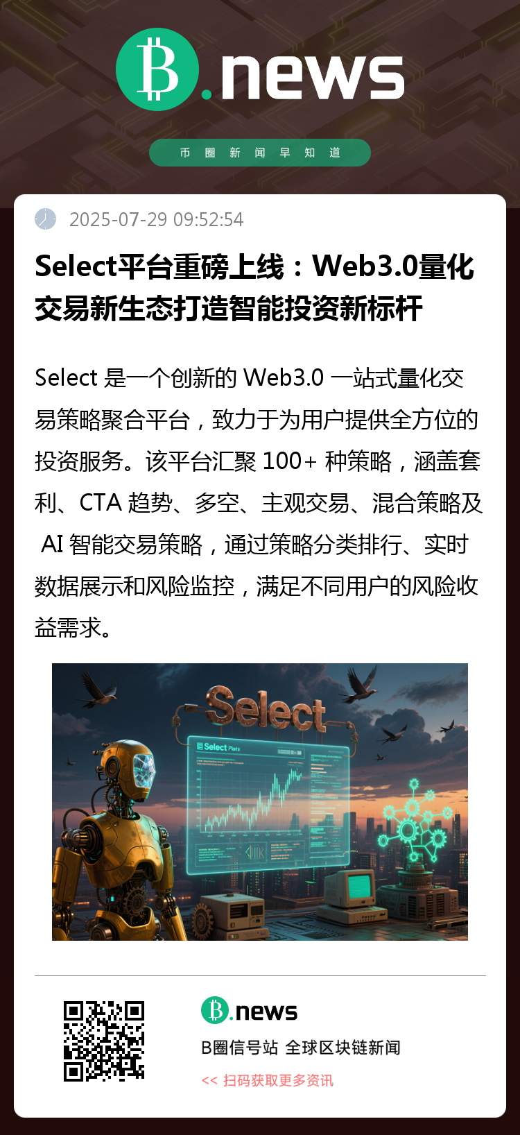 Select 是一个创新的 Web3.0 一站式量化交易策略聚合平台,致力于为用户提供全方位的投资服务。