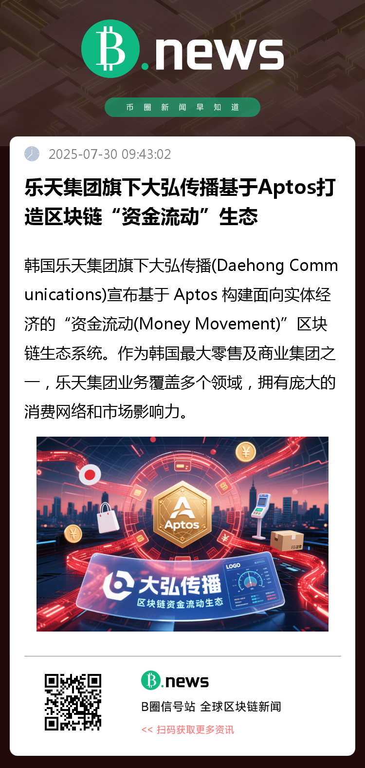 韩国乐天集团旗下大弘传播(Daehong Communications)宣布基于 Aptos 构建面向实体经济的“资金流动(Money Movement)”区块链生态系统。作为韩国最大零售及商业集团之一,乐天集团业务覆盖多个领域,拥有庞大的消费网络和市场影响力。