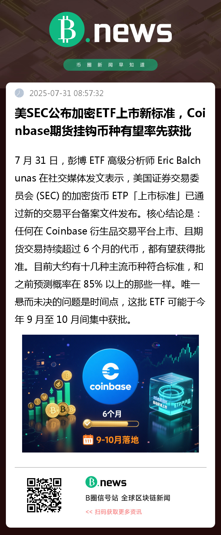核心结论是:任何在 Coinbase 衍生品交易平台上市、且期货交易持续超过 6 个月的代币,都有望获得批准。目前大约有十几种主流币种符合标准,和之前预测概率在 85% 以上的那些一样。唯一悬而未决的问题是时间点,这批 ETF 可能于今年 9 月至 10 月间集中获批。