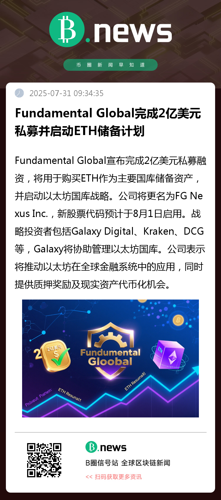 Fundamental Global宣布完成2亿美元私募融资,将用于购买ETH作为主要国库储备资产,并启动以太坊国库战略。公司将更名为FG Nexus Inc.,新股票代码预计于8月1日启用。战略投资者包括Galaxy Digital、Kraken、DCG等,Galaxy将协助管理以太坊国库。公司表示将推动以太坊在全球金融系统中的应用,同时提供质押奖励及现实资产代币化机会。