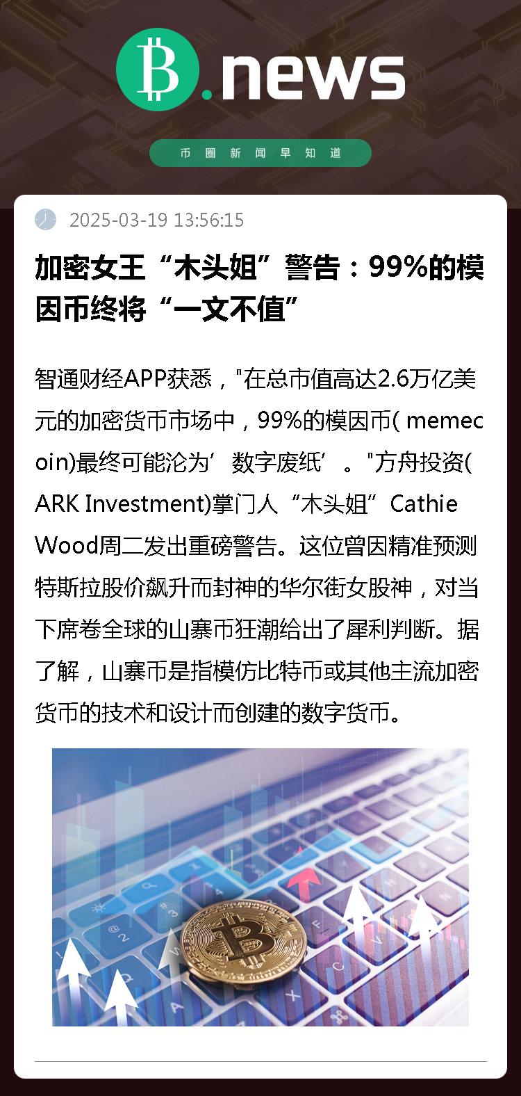 智通财经APP获悉,"在总市值高达2.6万亿美元的加密货币市场中,99%的模因币( memecoin)最终可能沦为’数字废纸’。"方舟投资(ARK Investment)掌门人“木头姐”Cathie Wood周二发出重磅警告。这位曾因精准预测特斯拉股价飙升而封神的华尔街女股神,对当下席卷全球的山寨币狂潮给出了犀利判断。据了解,山寨币是指模仿比特币或其他主流加密货币的技术和设计而创建的数字货币。
