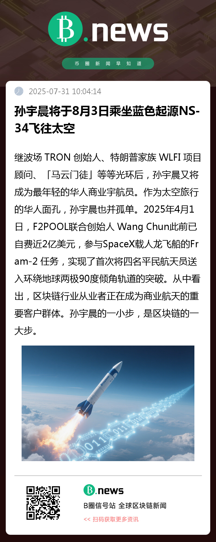 作为太空旅行的华人面孔,孙宇晨也并孤单。2025年4月1日,F2POOL联合创始人 Wang Chun此前已自费近2亿美元,参与SpaceX载人龙飞船的Fram-2 任务,实现了首次将四名平民航天员送入环绕地球两极90度倾角轨道的突破。可以说,区块链行业从业者正在成为商业航天的重要客户群体。