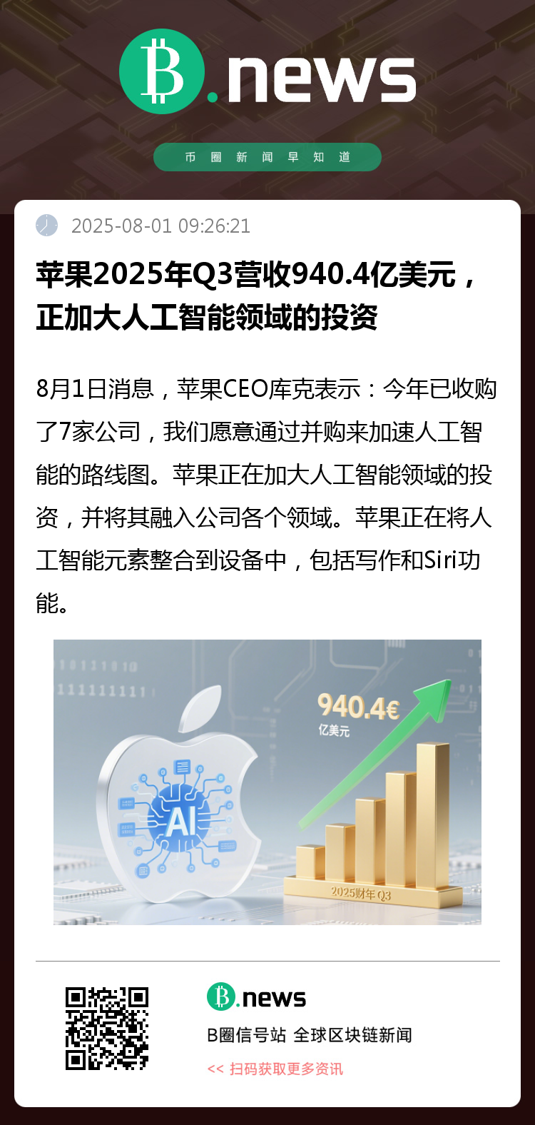 8月1日消息,苹果CEO库克表示:今年已收购了7家公司,我们愿意通过并购来加速人工智能的路线图。苹果正在加大人工智能领域的投资,并将其融入公司各个领域。苹果正在将人工智能元素整合到设备中,包括写作和Siri功能。