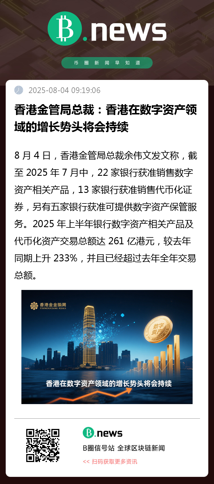 8 月 4 日,香港金管局总裁余伟文发文称,截至 2025 年 7 月中,22 家银行获准销售数字资产相关产品,13 家银行获准销售代币化证券,另有五家银行获准提供数字资产保管服务。
