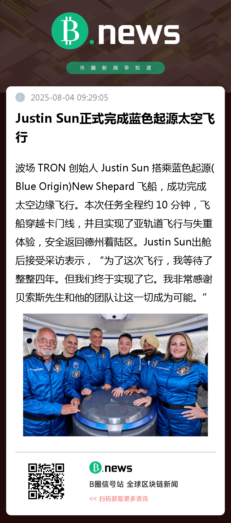 Justin Sun出舱后接受采访表示,“为了这次飞行,我等待了整整四年。但我们终于实现了它。我非常感谢贝索斯先生和他的团队让这一切成为可能。感谢我的爸爸妈妈把我带到这个世界上。当我从太空中望向地球时,地球真的非常渺小——但那是我们的家园。我们必须尽我们所能去保护它。这次是我迈向太空的第一次承诺和第一步,未来还会有更多。”