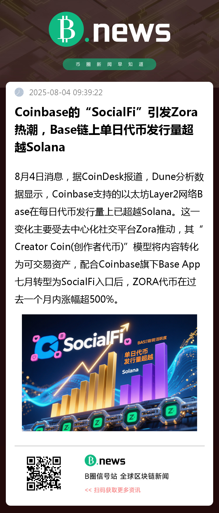 8月4日消息,据CoinDesk报道,Dune分析数据显示,Coinbase支持的以太坊Layer2网络Base在每日代币发行量上已超越Solana。这一变化主要受去中心化社交平台Zora推动,其“Creator Coin(创作者代币)”模型将内容转化为可交易资产,配合Coinbase旗下Base App七月转型为SocialFi入口后,ZORA代币在过去一个月内涨幅超500%。