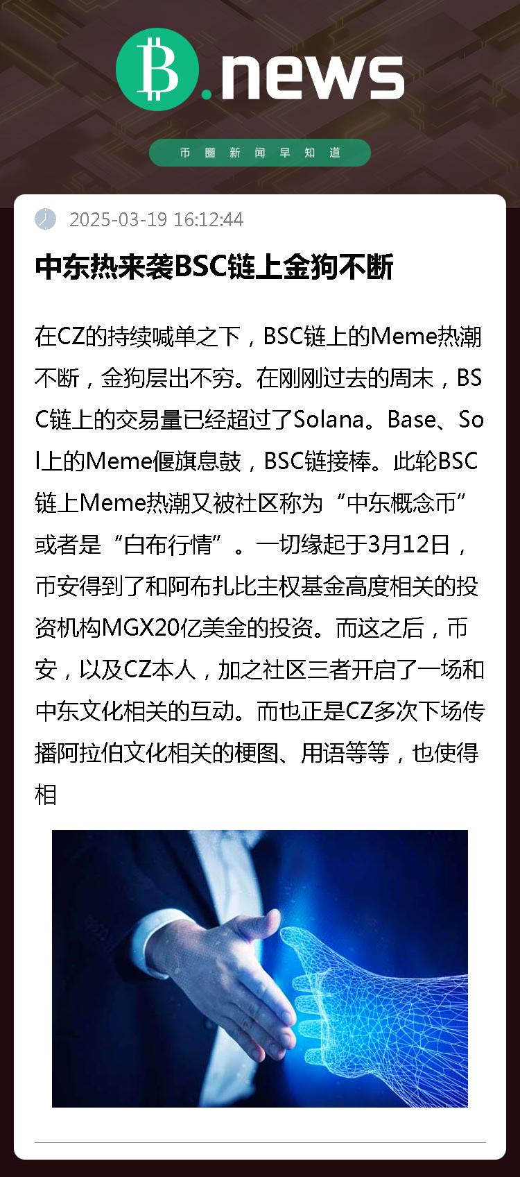 此轮BSC链上Meme热潮又被社区称为“中东概念币”或者是“白布行情”。一切缘起于3月12日,币安得到了和阿布扎比主权基金高度相关的投资机构MGX20亿美金的投资。
