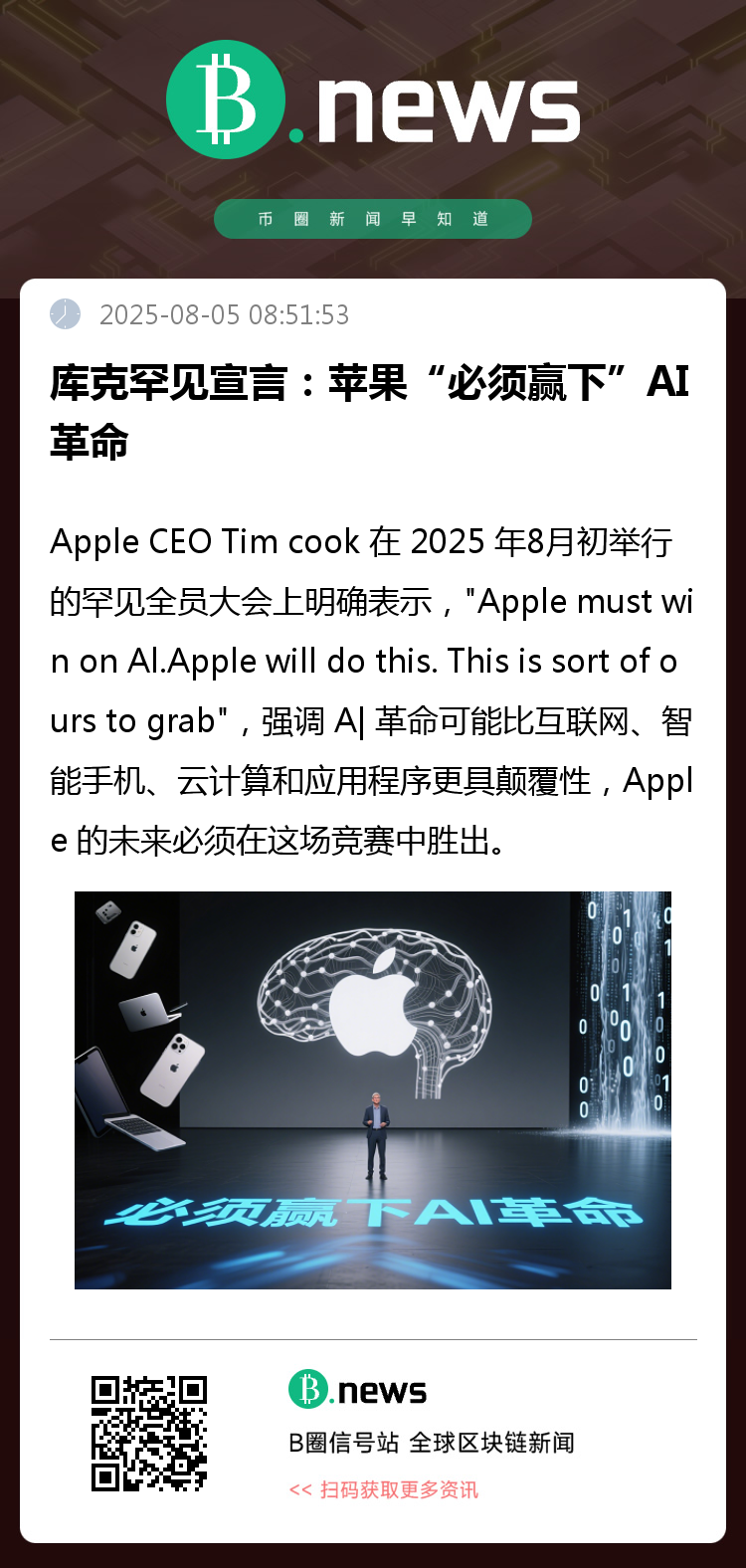 Apple CEO Tim cook 在 2025 年8月初举行的罕见全员大会上明确表示,"Apple must win on Al.Apple will do this. This is sort of ours to grab",强调 A| 革命可能比互联网、智能手机、云计算和应用程序更具颠覆性,Apple 的未来必须在这场竞赛中胜出。他承认 Apple 经常不是第一个进入新技术领域的公司,但最终能凭借革新定义现代化产品,他将这种路径比作过去 Mac、iPhone、iPad 和 iPod 的推出模式。