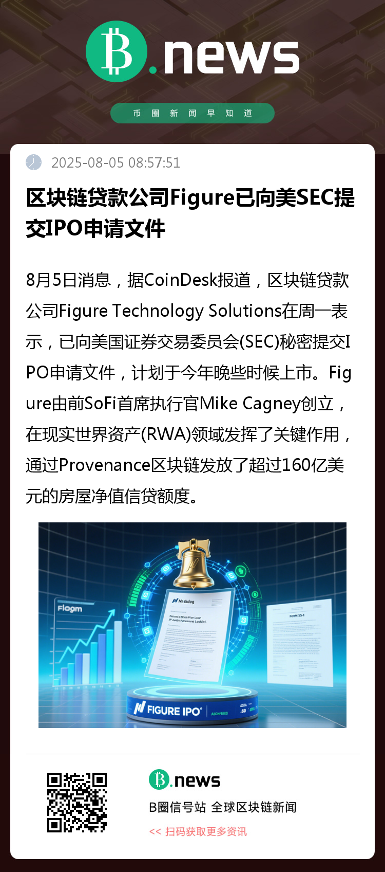 8月5日消息,据CoinDesk报道,区块链贷款公司Figure Technology Solutions周一表示,已向美国证券交易委员会(SEC)秘密提交IPO申请文件,计划于今年晚些时候上市。Figure由前SoFi首席执行官Mike Cagney创立,在现实世界资产(RWA)领域发挥了关键作用,通过Provenance区块链发放了超过160亿美元的房屋净值信贷额度。