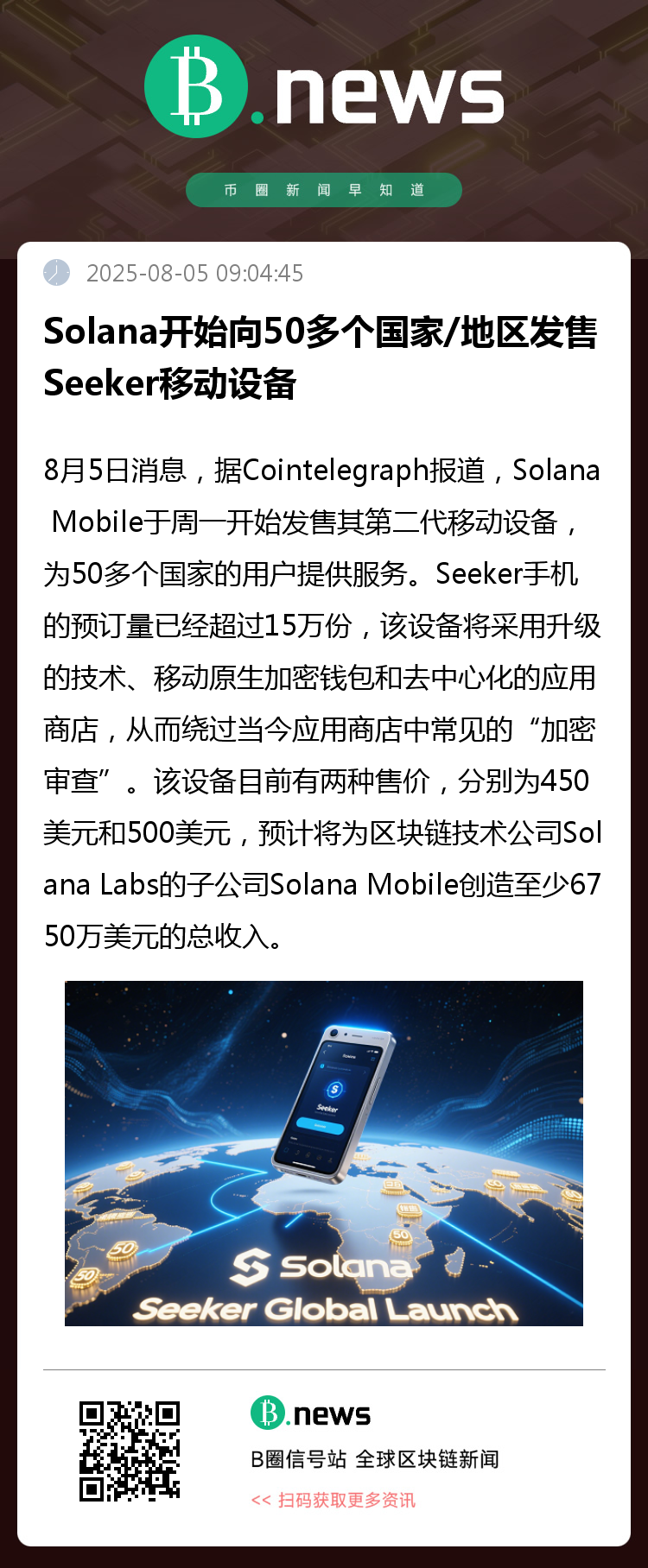 8月5日消息,据Cointelegraph报道,Solana Mobile已于周一开始发售其第二代移动设备,为50多个国家的用户提供服务。