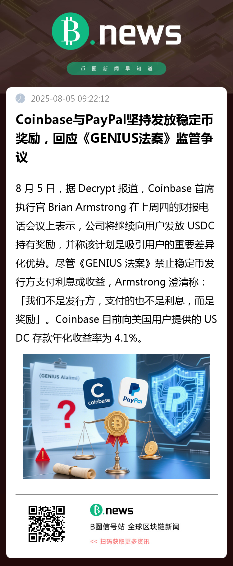 8 月 5 日,据 Decrypt 报道,Coinbase 首席执行官 Brian Armstrong 在上周四的财报电话会议上表示,公司将继续向用户发放 USDC 持有奖励,并称该计划是吸引用户的重要差异化优势。