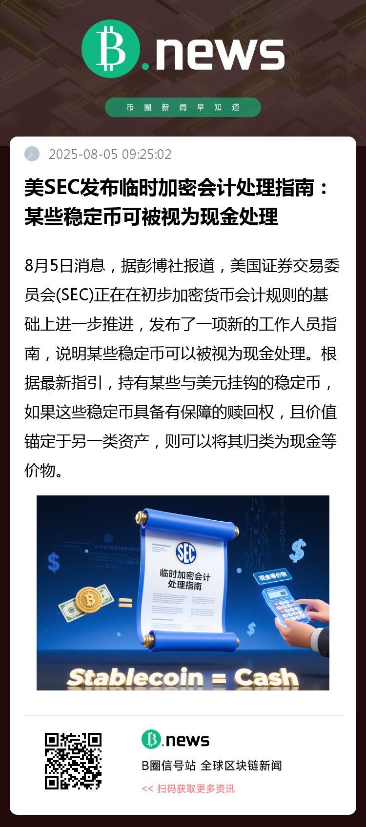 8月5日消息,据彭博社报道,美国证券交易委员会(SEC)正在在初步加密货币会计规则的基础上进一步推进,发布了一项新的工作人员指南,说明某些稳定币可以被视为现金处理。根据最新指引,持有某些与美元挂钩的稳定币,如果这些稳定币具备有保障的赎回权,且价值锚定于另一类资产,则可以将其归类为现金等价物。
