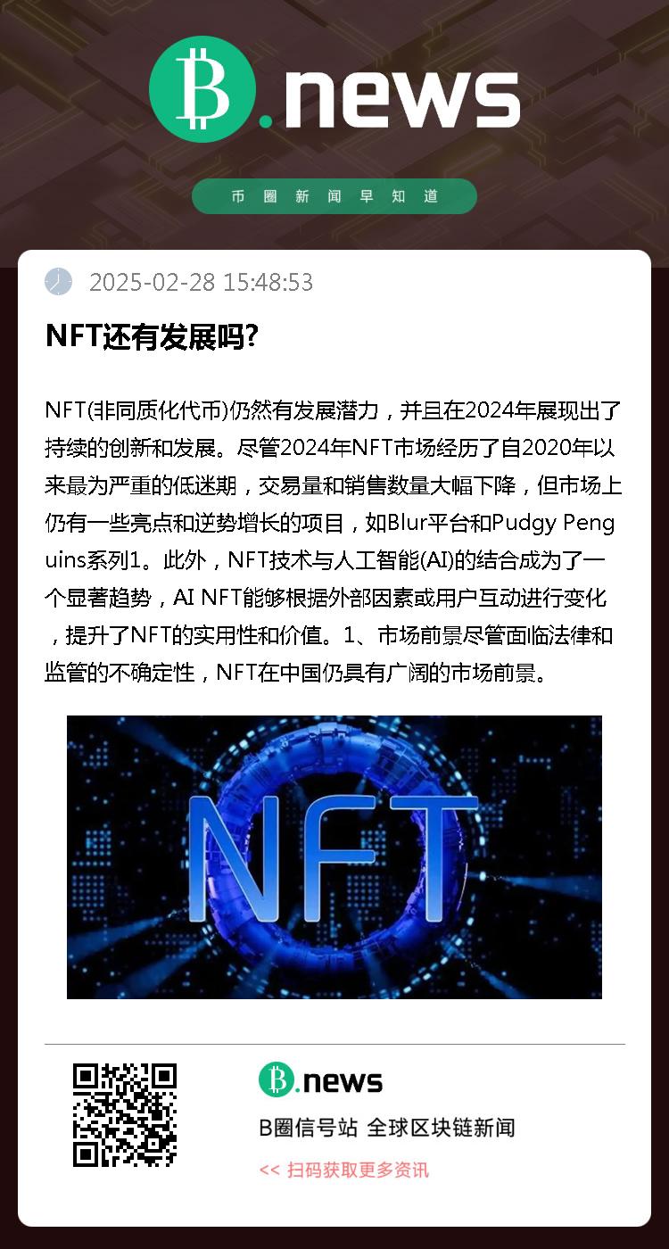 NFT(非同质化代币)仍然有发展潜力,并且在2024年展现出了持续的创新和发展。尽管2024年NFT市场经历了自2020年以来最为严重的低迷期,交易量和销售数量大幅下降,但市场上仍有一些亮点和逆势增长的项目,如Blur平台和Pudgy Penguins系列1。