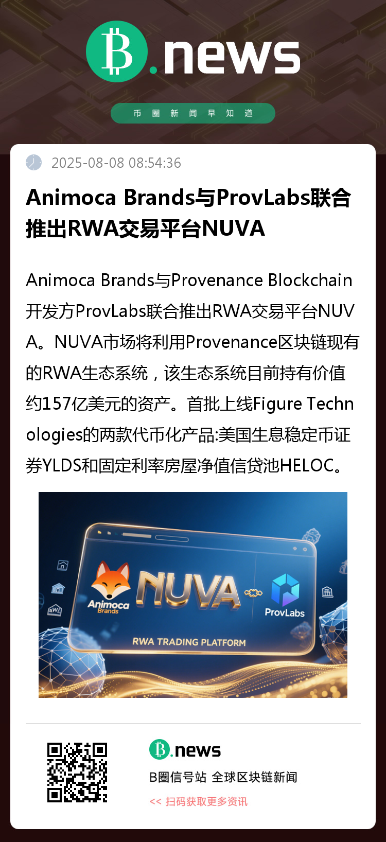 8月8日消息,据Cointelegraph报道,Animoca Brands与Provenance Blockchain开发方ProvLabs联合推出RWA交易平台NUVA。NUVA市场将利用Provenance区块链现有的RWA生态系统,该生态系统目前持有价值约157亿美元的资产。首批上线Figure Technologies的两款代币化产品:美国生息稳定币证券YLDS和固定利率房屋净值信贷池HELOC。