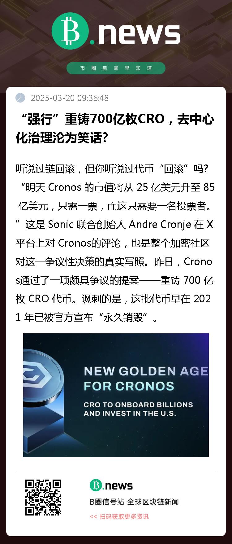 昨日,Cronos通过了一项颇具争议的提案——重铸 700 亿枚 CRO 代币。讽刺的是,这批代币早在 2021 年已被官方宣布“永久销毁”,而目前 CRO 的流通供应量仅为 273 亿枚。这一决定几乎等于让 CRO 总供应量瞬间翻倍。