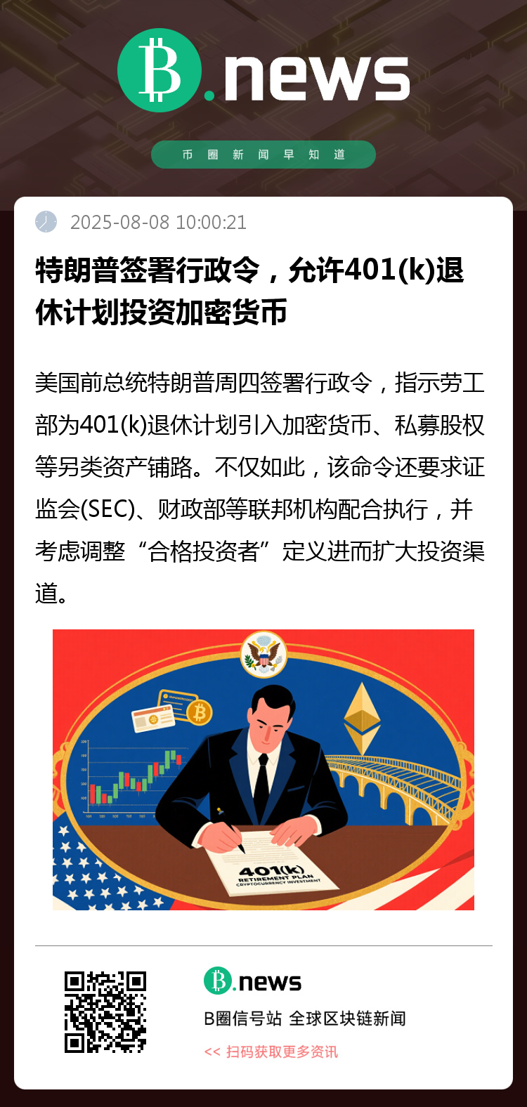 这是特朗普就职以来签署的多项加密相关行政命令之一,此前他已推动建立比特币战略储备。市场人士称,此举有望为退休投资者提供更多资产配置选择,标志特朗普政府持续推动数字资产主流化。