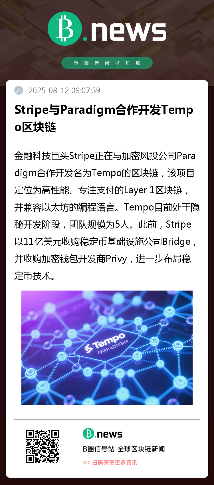 8月12日消息,据Fortune报道,金融科技巨头Stripe正在与加密风投公司Paradigm合作开发名为Tempo的区块链,该项目定位为高性能、专注支付的Layer 1区块链,并兼容以太坊的编程语言。