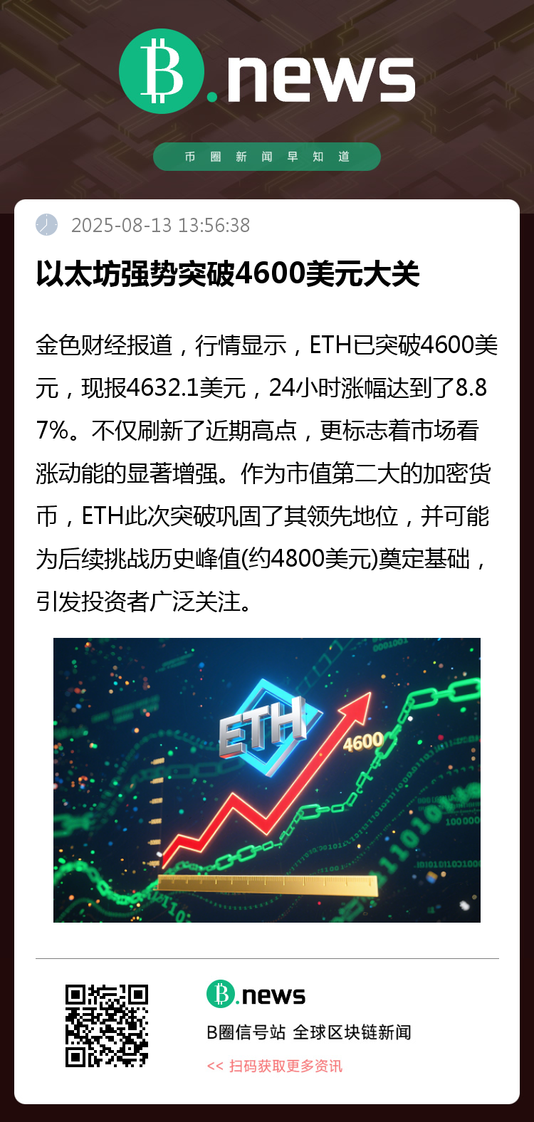 金色财经报道,行情显示,ETH突破4600美元,现报4632.1美元,24小时涨幅达到8.87%。不仅刷新了近期高点,更标志着市场看涨动能显著增强。作为市值第二大的加密货币,ETH此次突破巩固了其领先地位,并可能为后续挑战历史峰值(约4800美元)奠定基础,引发投资者广泛关注。