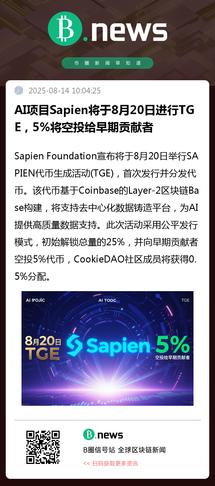 Sapien Foundation宣布将于8月20日举行SAPIEN代币生成活动(TGE),首次发行并分发代币。