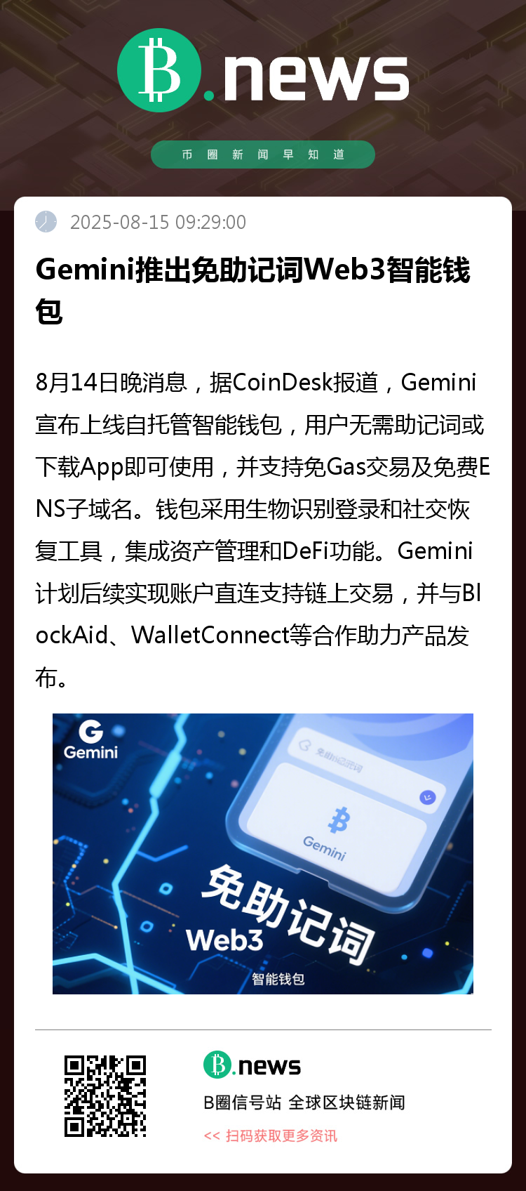 钱包采用生物识别登录和社交恢复工具,集成资产管理和DeFi功能。Gemini计划后续实现账户直连支持链上交易,并与BlockAid、WalletConnect等合作助力产品发布。