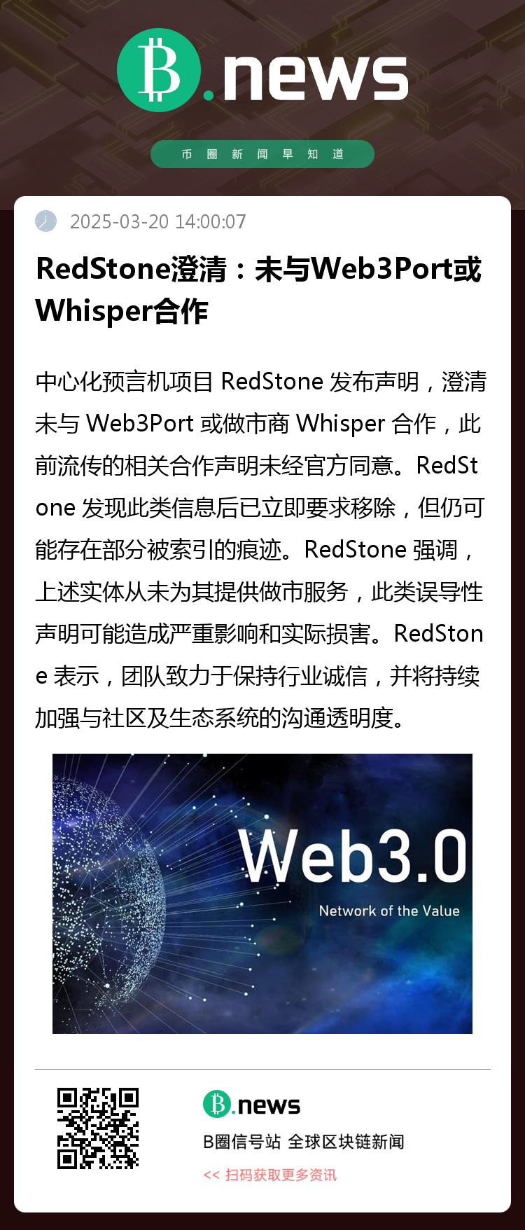 中心化预言机项目 RedStone 发布声明,澄清未与 Web3Port 或做市商 Whisper 合作,此前流传的相关合作声明未经官方同意。