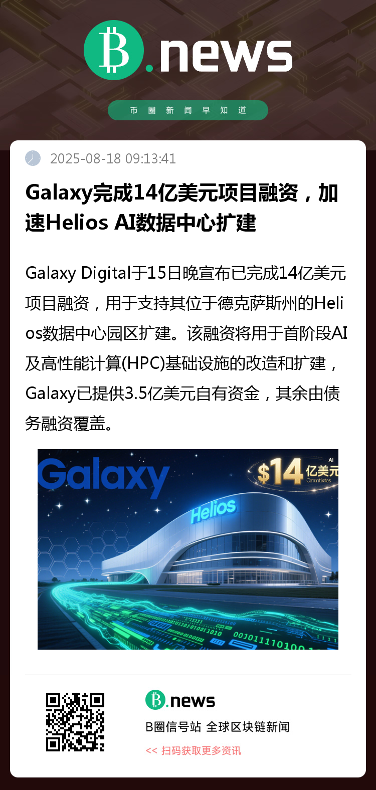 Galaxy Digital宣布已完成14亿美元项目融资,用于支持其位于德克萨斯州的Helios数据中心园区扩建。该融资将用于首阶段AI及高性能计算(HPC)基础设施的改造和扩建,Galaxy已提供3.5亿美元自有资金,其余由债务融资覆盖。