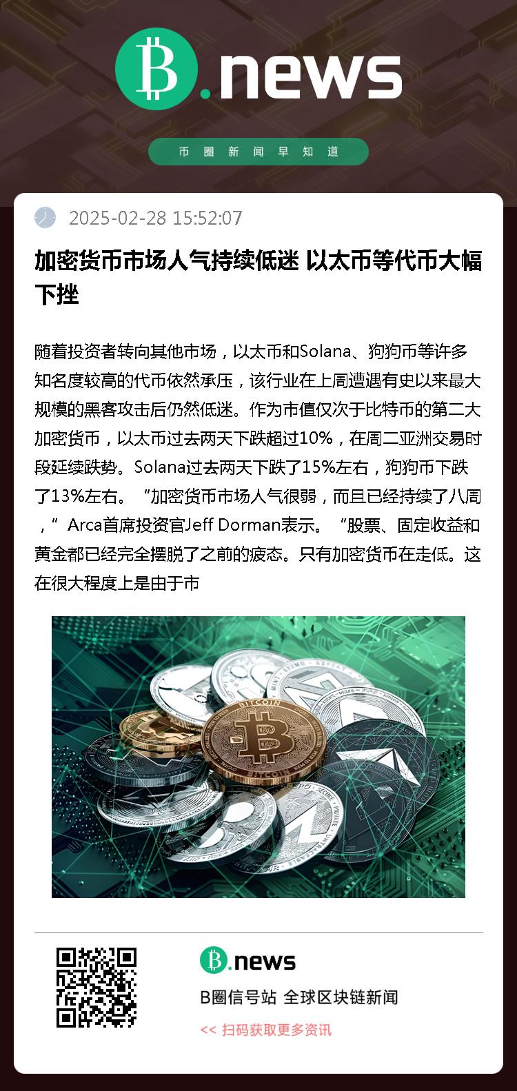 随着投资者转向其他市场,以太币和Solana、狗狗币等许多知名度较高的代币依然承压,该行业在上周遭遇有史以来最大规模的黑客攻击后仍然低迷。