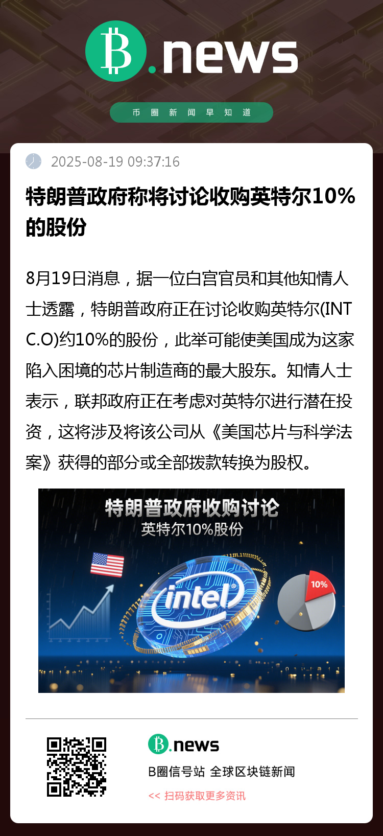8月19日消息,据一位白宫官员和其他知情人士透露,特朗普政府正在讨论收购英特尔(INTC.O)约10%的股份,此举可能使美国成为这家陷入困境的芯片制造商的最大股东。