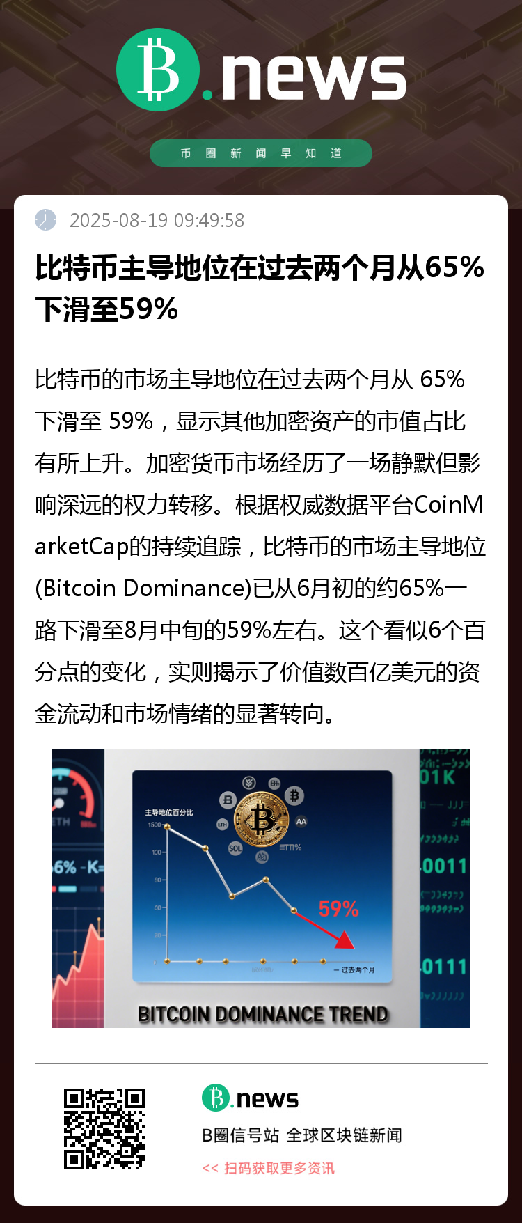 比特币的市场主导地位在过去两个月从 65% 下滑至 59%,显示其他加密资产的市值占比有所上升。
