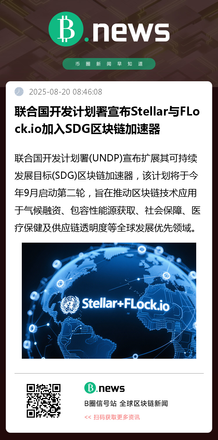 联合国开发计划署(UNDP)宣布扩展其可持续发展目标(SDG)区块链加速器,新增全球合作伙伴Stellar Development Foundation(SDF)和FLock.io,加入现有创始伙伴Blockchain for Good Alliance(BGA)和EMURGO Labs。