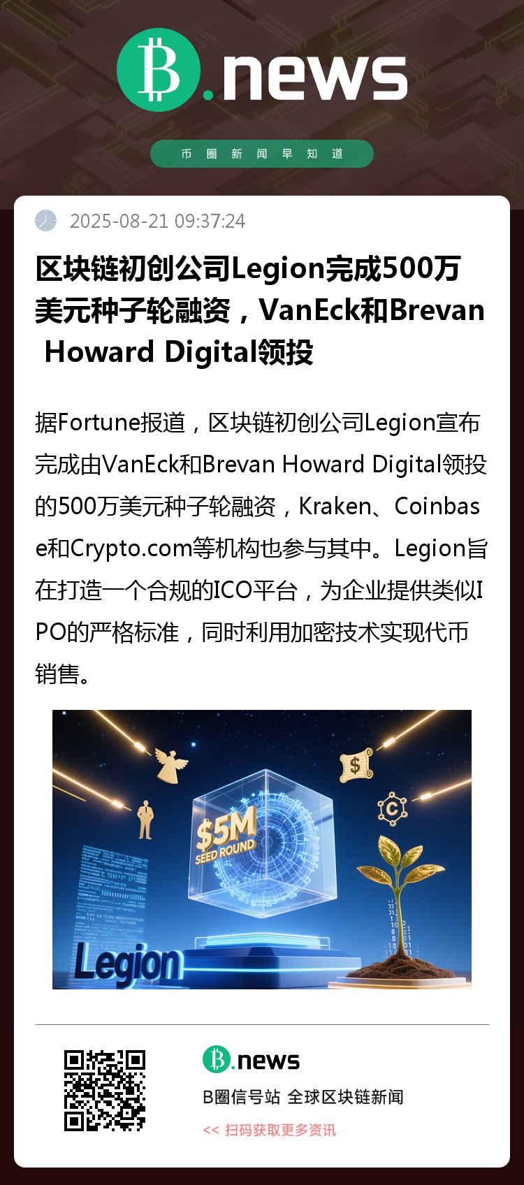 据Fortune报道,区块链初创公司Legion宣布完成由VanEck和Brevan Howard Digital领投的500万美元种子轮融资,Kraken、Coinbase和Crypto.com等机构也参与其中。