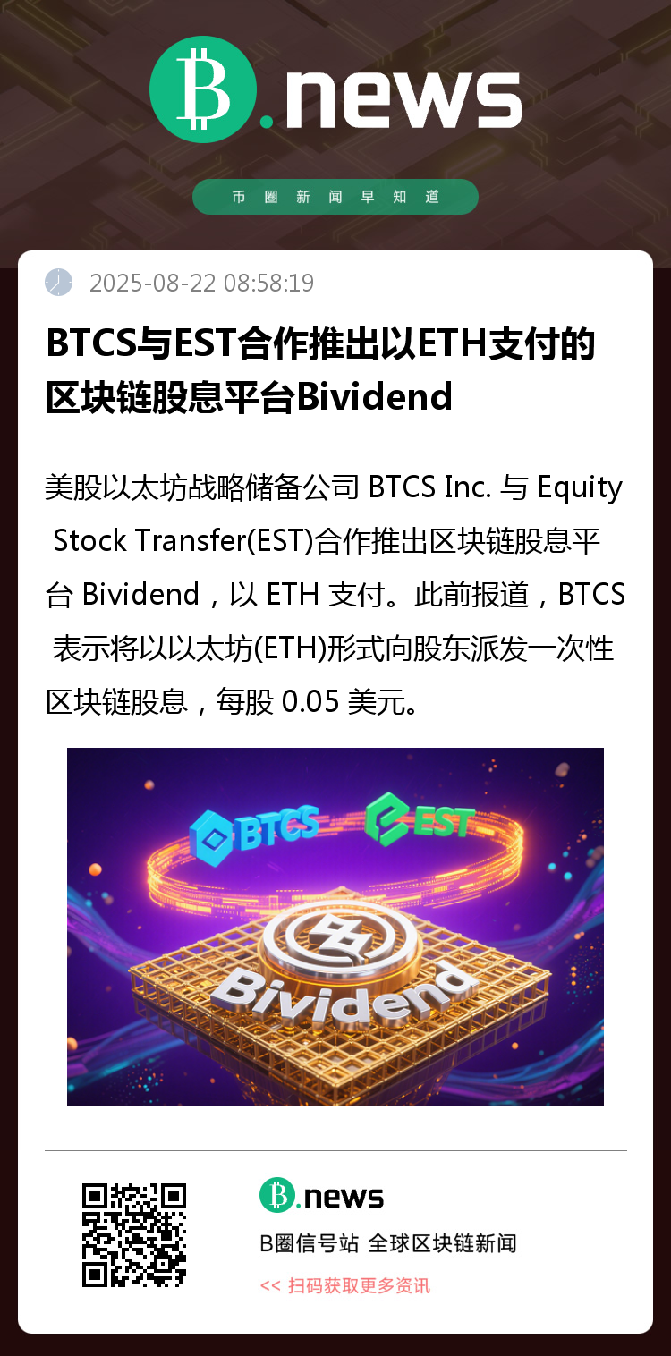 美股以太坊战略储备公司 BTCS Inc. 与 Equity Stock Transfer(EST)合作推出区块链股息平台 Bividend,以 ETH 支付。