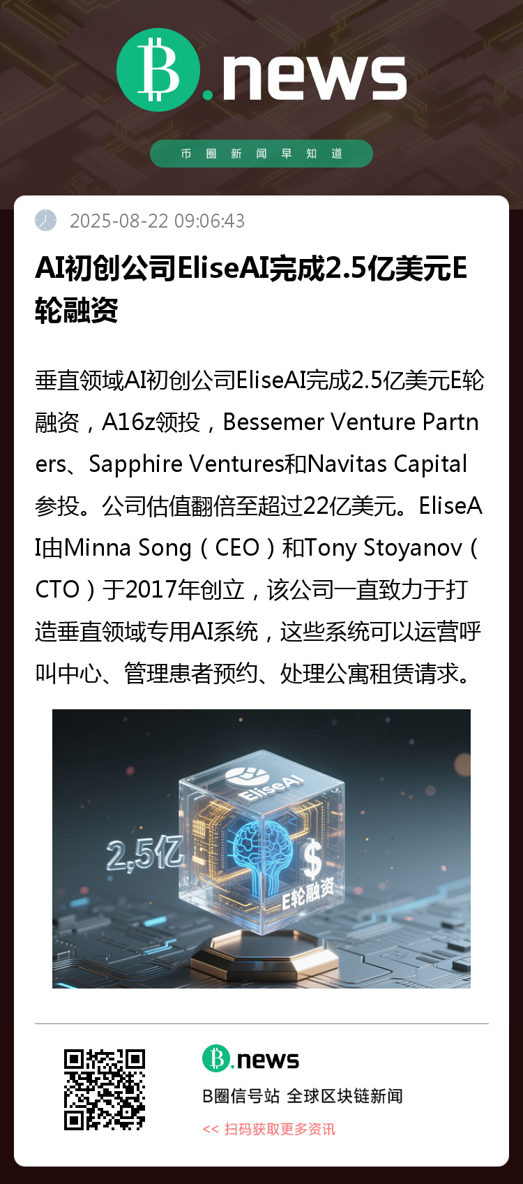 垂直领域AI初创公司 EliseAI 完成2.5亿美元E轮融资,A16z领投,Bessemer Venture Partners、Sapphire Ventures 和 Navitas Capital 参投。