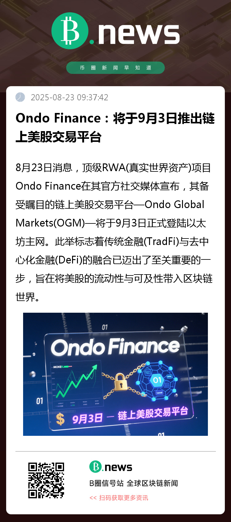 8月23日,顶级RWA(真实世界资产)项目Ondo Finance在其官方社交媒体宣布,其备受瞩目的链上美股交易平台——Ondo Global Markets(OGM)——将于9月3日正式登陆以太坊主网。此举标志着传统金融(TradFi)与去中心化金融(DeFi)的融合迈出了至关重要的一步,旨在将美股的流动性与可及性带入区块链世界。